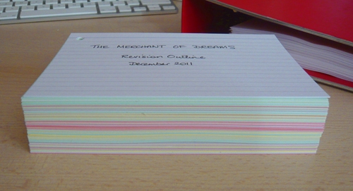 In order to get a bird’s-eye view of the whole book, it’s essential to have an outline. Even if you never use an outline when creating your first draft, it’s invaluable in the revision stage, because it’s damned hard to hold 100,000+ words of prose in your head. It’s also a great tool for that most dreaded of writing tasks: the synopsis! Hence, the next stage is to go through the manuscript and create one index card per scene.